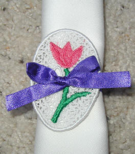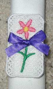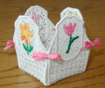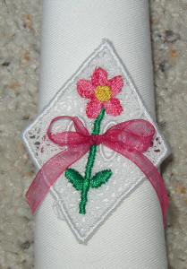 Spring Lace All of the lacy designs to make different sizes of baskets like these, napkin rings, and delicate coasters! (Click on picture to view a larger version) Copyright 2005, SoftSew, LLC All rights reserved. These lovely lace designs make it easy to create wonderful keepsakes! Sew them on water-soluble stabilizer, wash the stabilizer away, and you've got lace! The design collection includes coasters, baskets, napkin rings, and floral motifs! The coasters will add an elegant touch to your home or make a lovely gift. There are two ways to make lace baskets -- either as four-sided, one - piece baskets (all you have to do is tack the sides together!), or you can sew the sides and bottom out separately and attach them with a zigzag stitch or by hand -- or using ribbon as shown above! The one-piece baskets come in three sizes (note that not all sizes will sew on all machines -- check below for the sizes!). The napkin rings will add a special touch to a tea or luncheon, or can be attached to a gift! You simply sew the design and lace ribbon through the re-enforced holes! Finally, there are floral motifs