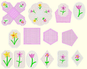 the lace stitched over the background fabric. Designs included:Note that there are multiple sizes of most designs. NOTE THAT ALL SIZES ARE INCLUDED, BUT NOT ALL EMBROIDERY MACHINES WILL SEW ALL OF THESE SIZES!!!